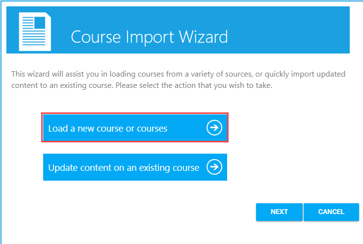 Select the Import New Courses Only radio button if you are only uploading new courses. Select the Update Existing Courses/Import New Courses radio button if you are both updating an existing course(s) and importing a new course(s) or if you want to update an existing course(s).