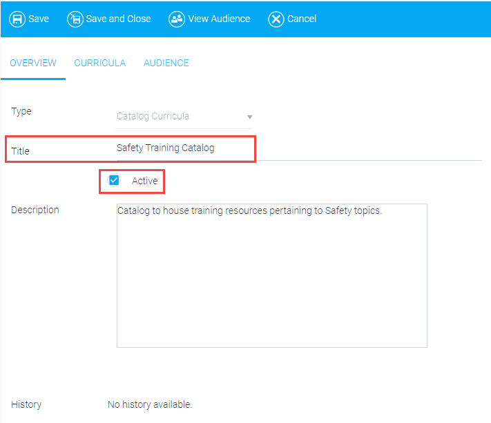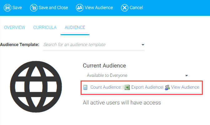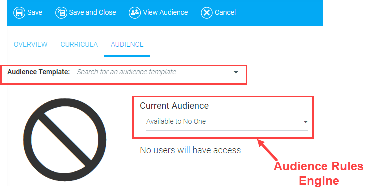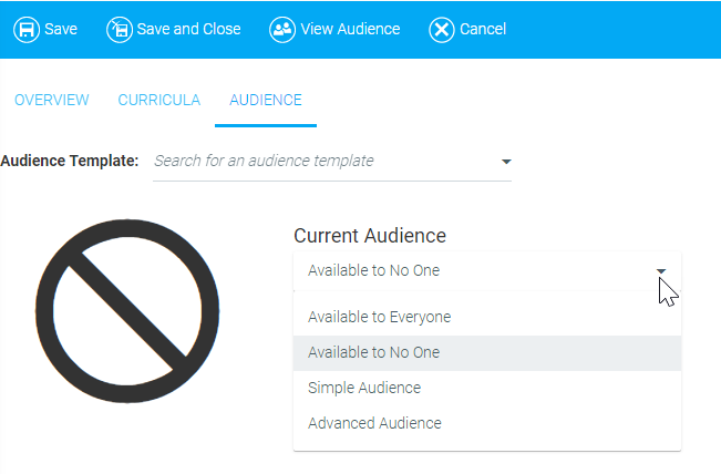 The audience of the Course Catalog must be defined before you can save and close. This can be accomplished through the Audience tab which is described below.