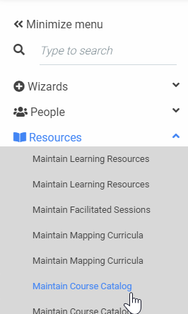 From the Administrator's Console, open the Navigation Bar and select Resources > Maintain Course Catalog.