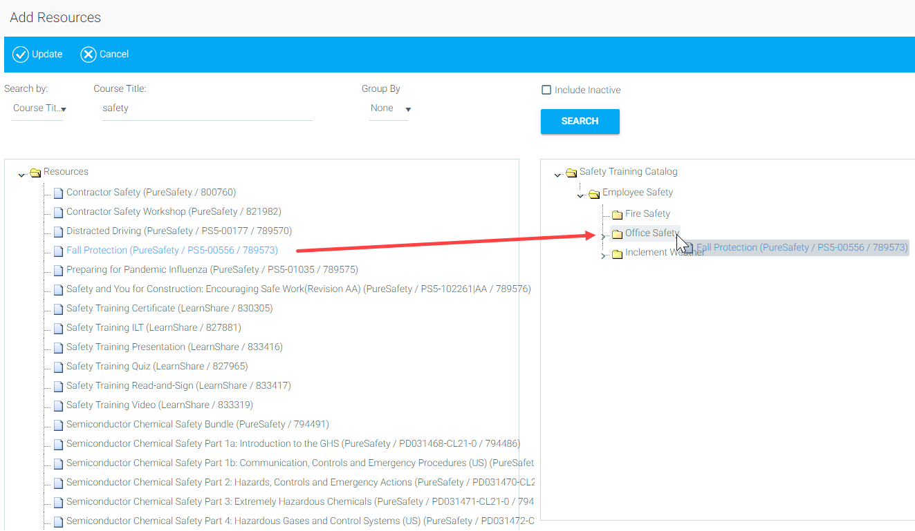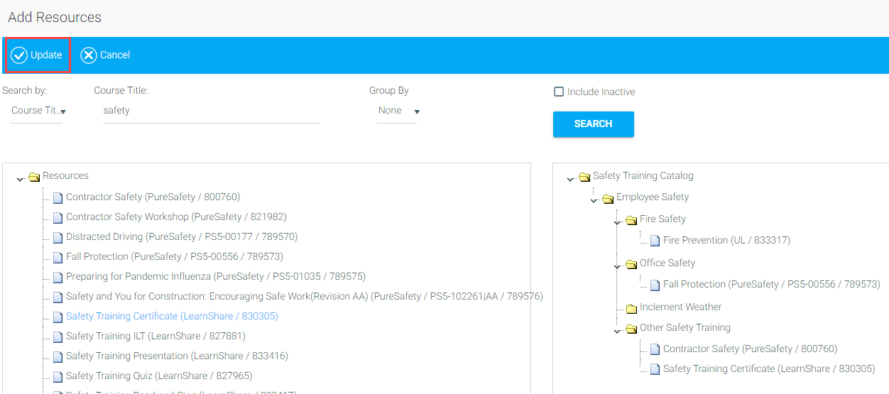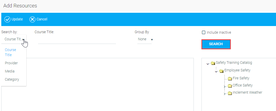 The Add Resources pop-up box will appear. Search for the desired courses. You can search by a specific course title, course provider, media type, resource type, or course category. When adding multiple courses to a curricula, it is usually quicker to search with broad options so that you can quickly pull over multiple courses. Click the Search button to see your results.