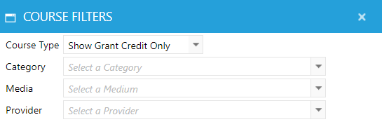 You can use the Filters button to limit the courses that will appear in the course box. When the Filters button is used, the Course Filters pop-up will open. Select Course Type, Category, Media Type, or Provider.