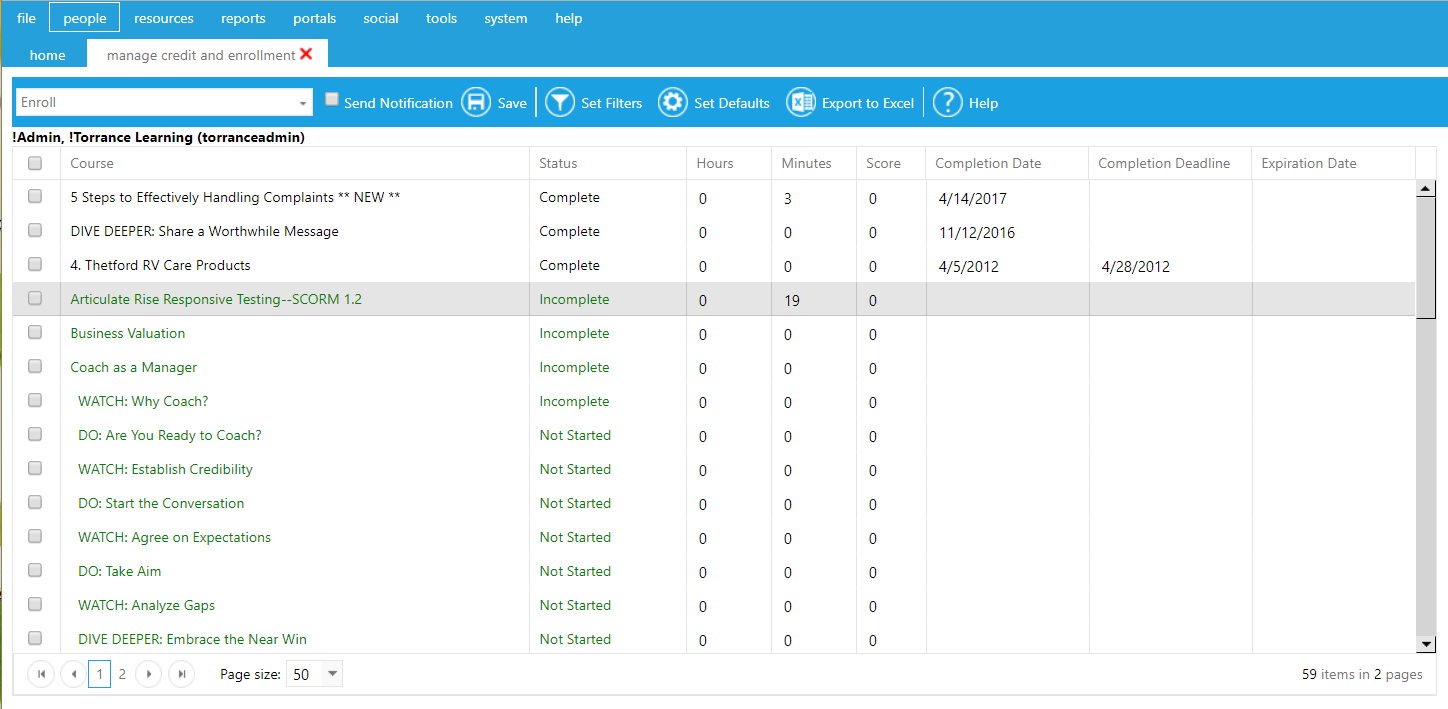 To handle this scenario, navigate to People > Manage Credit and Enrollment. Locate the enrollment and click the checkbox next to it. Then, use the drop-down menu in the top toolbar to select Revoke Completion.