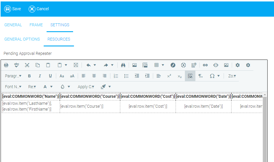 The Resources sub-tab allows you to use the rich text editor to make changes to the message sent regarding pending approvals.