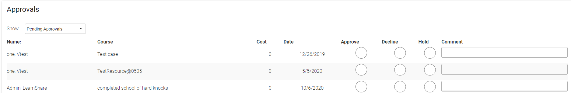 The Approvals widget provides a list of all items awaiting a user's approval. It generally provides the user's name awaiting approval, the course name, cost, and date. You have the ability to approve, decline, or hold a request. You can also leave a comment with your response.