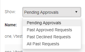 By default, you will see Pending Approvals upon accessing the widget. You can use the Show drop-down menu to view Past Approved Requests, Past Declined Requests, and All Past Requests.