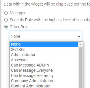 The default is for this widget to only display information pertaining to the Manager’s direct reports. However, it can also display information to users that have LMS administrative roles. If desired, select the “Security Role with the highest level of security” radio button. Selecting this option will allow users with other administrative roles in the LMS to view the activity of all of the users within their span of control. Remember if an administrator is also a manager they will see everyone within their administrative control, not just their direct reports. This list could get quite long for LMS Administrators with broad security.