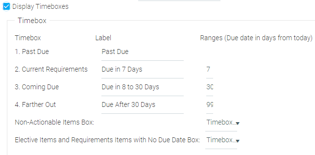 - Enter a text label, then enter a number in the Ranges field to determine which items should be displayed in this timebox. The range will begin at the day after the day listed for the Current Requirements box and go to the day entered in the Ranges field. For example, if a 7 was entered in the Current Requirements box and a 30 was entered in the Coming Due box, this box will display items that have a completion deadline in the next 8 to 30 days.