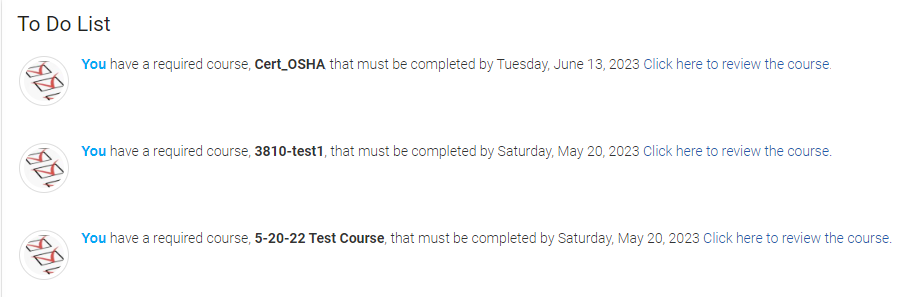 This widget shows a "To Do" list for the currently logged in user. This list can include required learning, approvals, evaluations, assessments, performance reviews, or goals that need to be completed by a user in a timely fashion.
