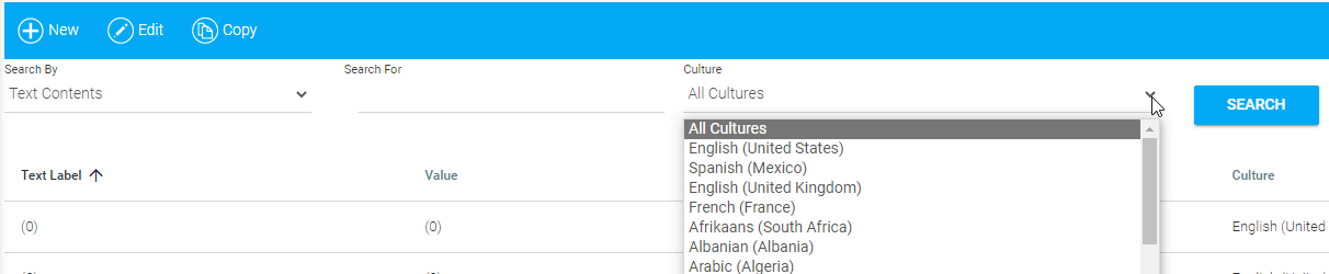 If your system is globalized, you can select a Culture from the drop-down on the initial search screen to look for on-screen text in a specific language.