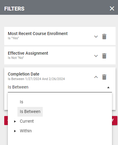 Filter pick lists can vary.  Some pick lists, such as the completion Date filter pick list, require dates or date ranges.  Click the drop-down box to view the different date range options.