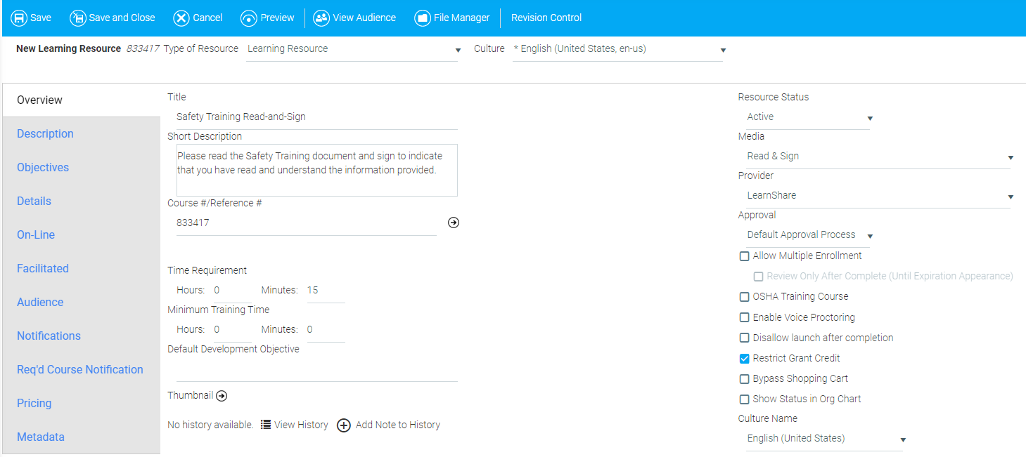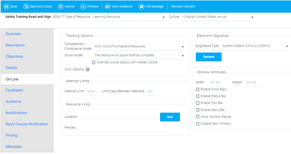 Each learning resource screen features many optional fields that can be used to provide additional information, assign settings, and allow more control for administrators. This document provides an explanation of these optional fields. For quick, step-by-step instructions on setting up a Read-and-Sign, please see Setting Up a Read and Sign.