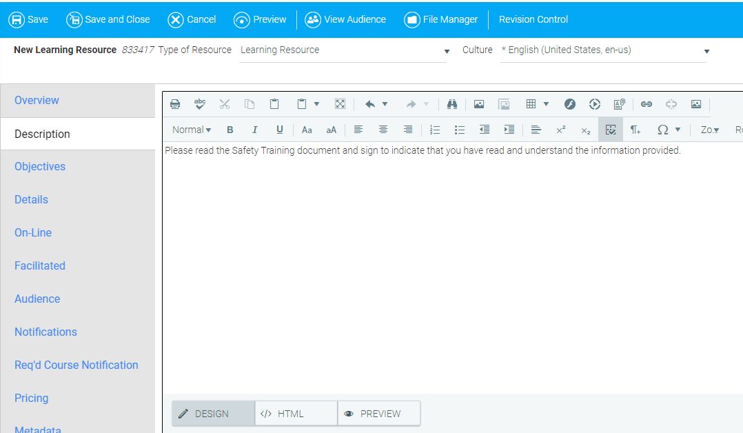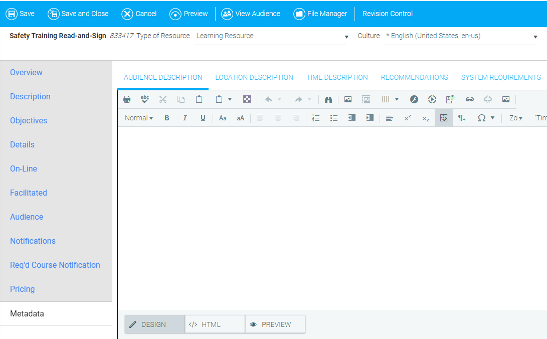 Recommendations: Enter any recommendations about the course for your users. If this tab is left blank, the Recommendations header will not be displayed on the Course Description page.