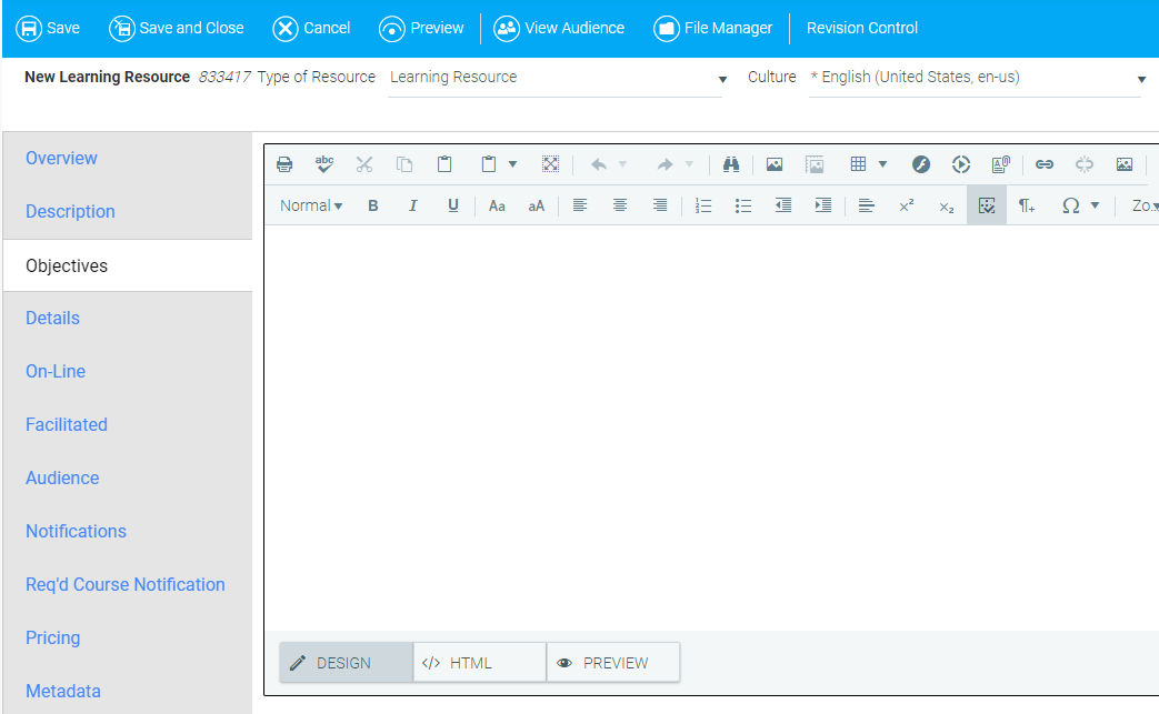 Use the Objectives tab to enter course objectives for the resource. The listed objectives will be visible on the Display Resource screen along with the course description.