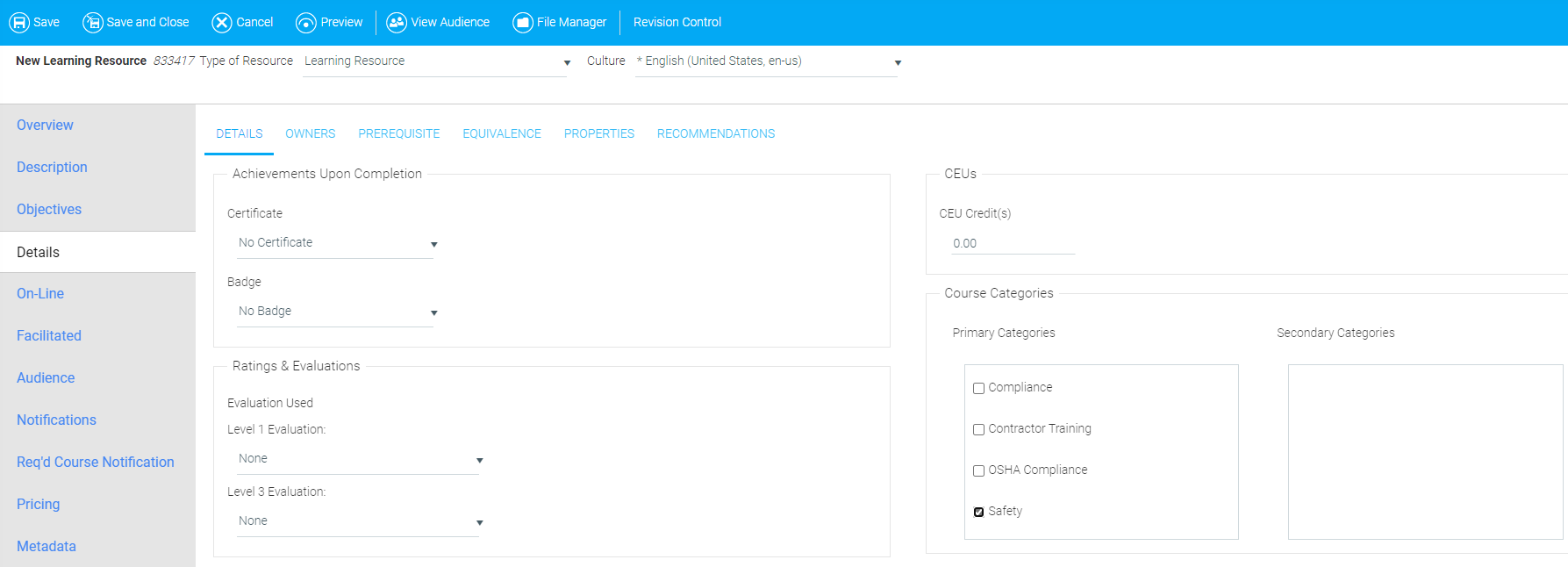 CEU Credit(s): This indicates the number of Continuing Education Unit credits for this resource. If this is not a continuing education course, leave this field set to 0.00.