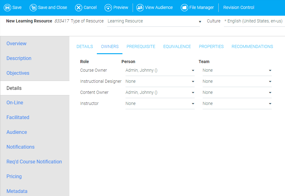 The Owners Sub-Tab allows you to assign a person or team to certain roles pertaining to the learning resource (e.g., Course Owner, Instructional Designer, Content Owner, and Instructor). The Instructor field applies to Facilitated (ILT) courses.