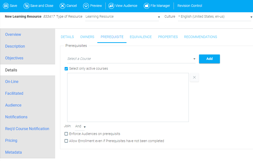 Setting a prerequisite for a resource prevents users from enrolling into the resource before the prerequisite is completed. You can set multiple learning resources to act as prerequisites. You can also enforce audience rules on prerequisite courses. For more information, see Managing Prerequisites.