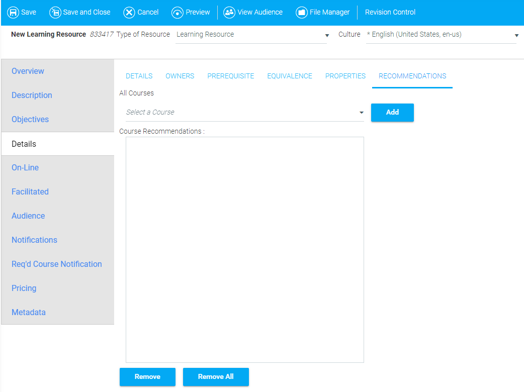 You can use this sub-tab to enter any recommended courses for users based on their completion of this resource. If this sub-tab is left blank, the Recommendations header will not be displayed on the Course Description page.