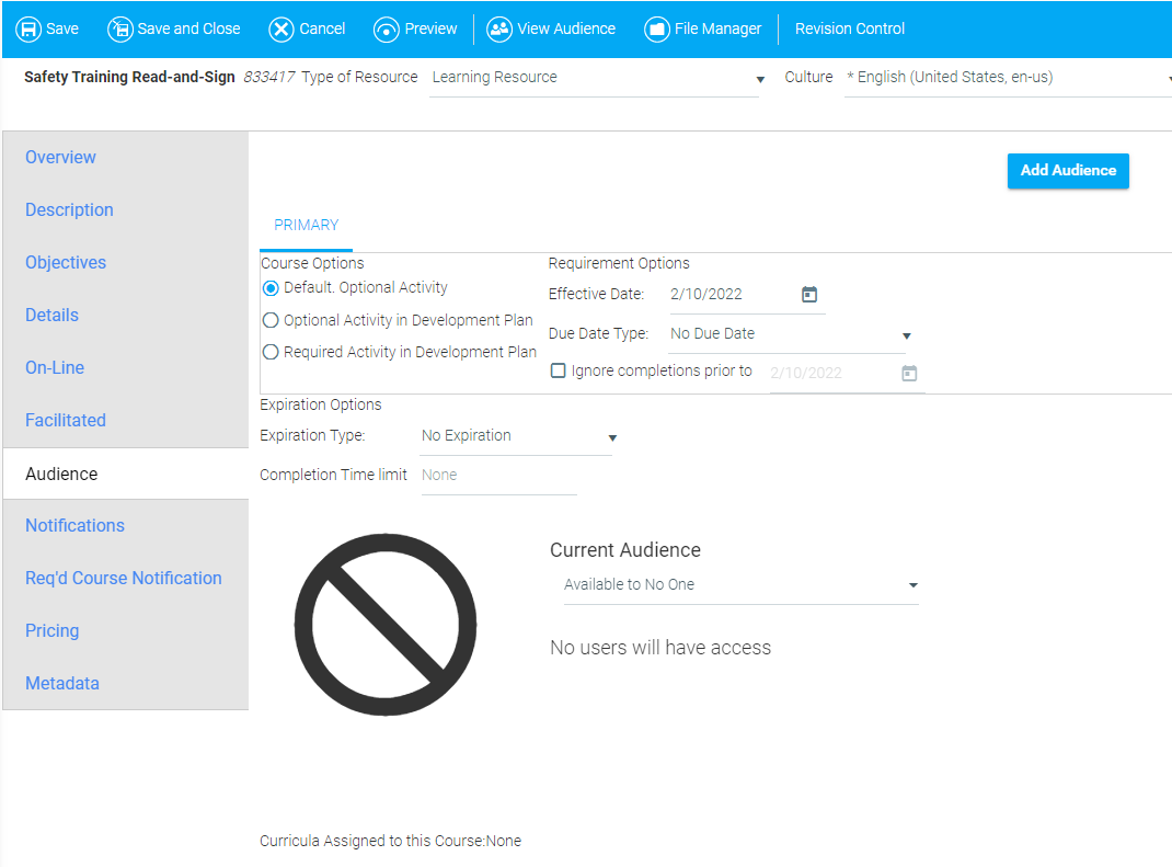 Use this screen to map a resource to a defined target audience. Audience mapping must be carefully considered as it is critical to the visibility and use of the resource to users. You can also use this screen to set expiration options and completion time limits.