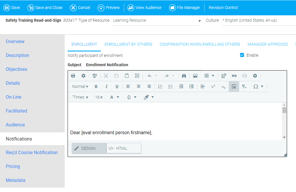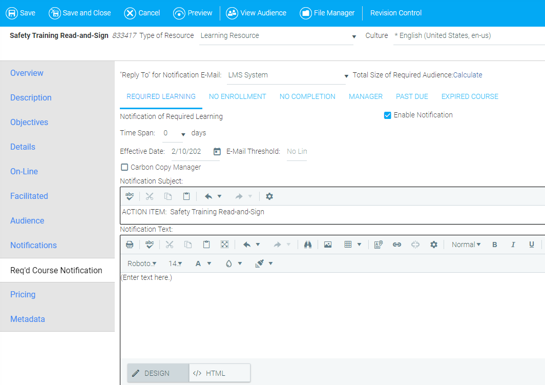 This tab allows notifications to be created and scheduled for required learning resources. These notifications can include: