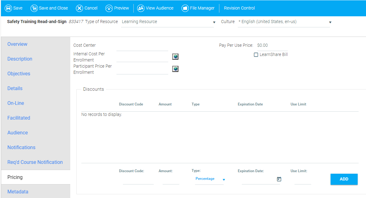 Pay Per Use Cost: This is a read only field that reflects the retail price per course if your organization is using pay-per-use pricing.