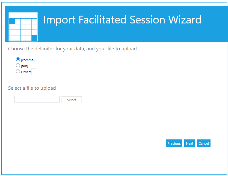 The Import Facilitated Sessions Wizard can be used both to upload new classes and to load attendance, enrollment, and credit data. To start the wizard, go to Resources > Import Facilitated Sessions Wizard in the administrative console. The wizard will open in a pop-up window.