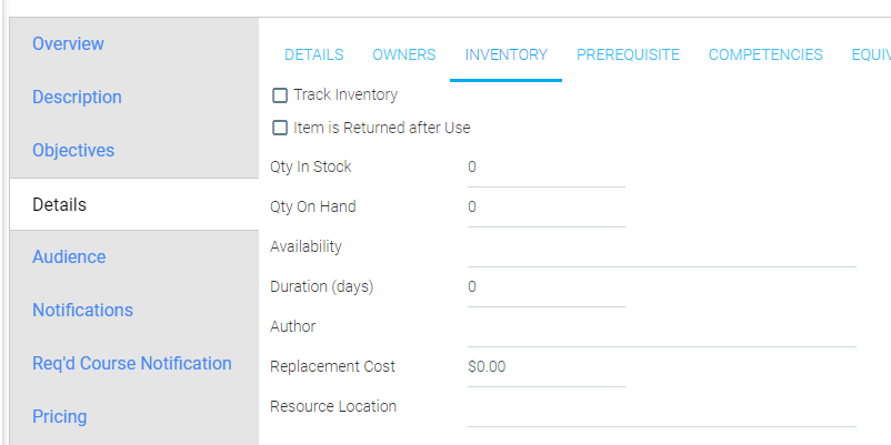 Go to the Details tab and the Inventory sub-tab. If you are using the Lending Library feature and you want the LMS to track the inventory for the resource, you must enter the inventory here and check the Track Inventory checkbox.