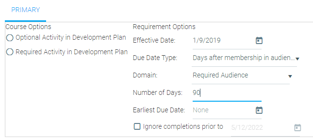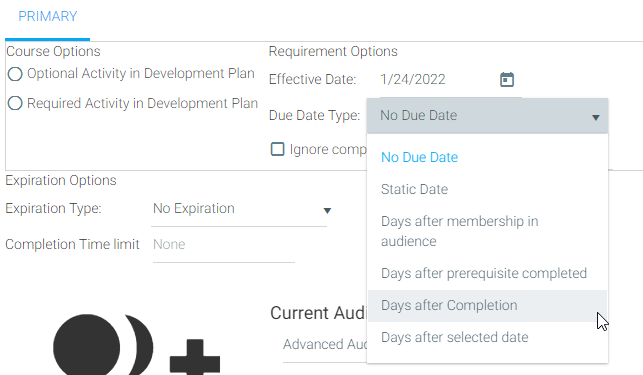 Next, apply the Course Requirement Options. In the Primary sub-tab of the Audience tab locate the Due Date Type field. Use the drop-down menu to make a selection. In this case, we'll be choosing Days after membership in audience.