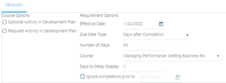 Next, look at the Requirement options on the Primary sub-tab. Use the Due Date Type drop-down menu to select Days after Completion.