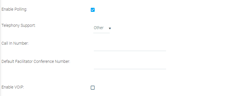 There is no Partner Code required, and also no check boxes for enabling audio/video, chat, or polling. There is, however, an "Enable Call Me" option. The other fields are the same as above. When you are finished filling them in, click Save.