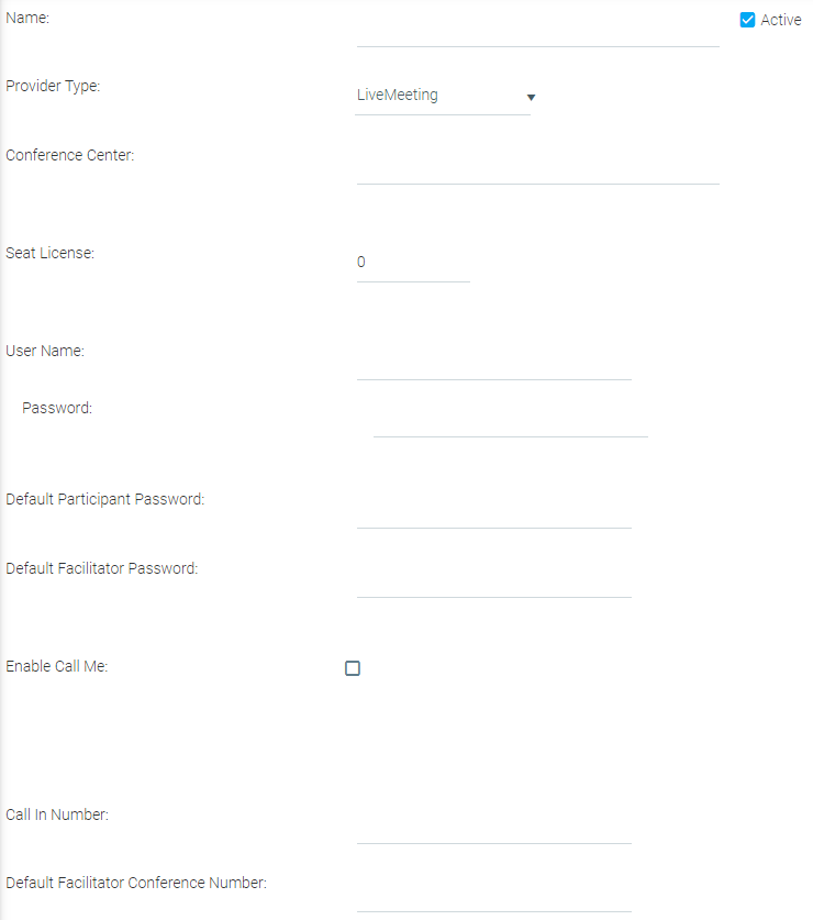 Adobe Connect does not have any field for type of Center. There is no Partner Code required, and also no check boxes for enabling audio/video, chat, or polling. There is also no "Call Me" option to enable. The other fields, however, are the same as above. When you are finished filling them in, click Save.