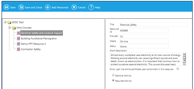 Required vs. Optional Resources - Resources will default to the Required status, as indicated by the red R on the resource icon. If desired, a resource can be optional within the certificate. To change the resource status, click on the resource title in the Administer Curricula window. The resource details will display on the right side of the screen.