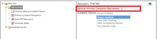 Section Requirements for Optional Resources – Within any section of a certificate, you can indicate how many of the optional courses must be completed in order to complete the certificate. For example, if a section contains five optional resources, you might require the learner to complete any two of them. Or if no optional resources need to be completed, you can set this to zero.