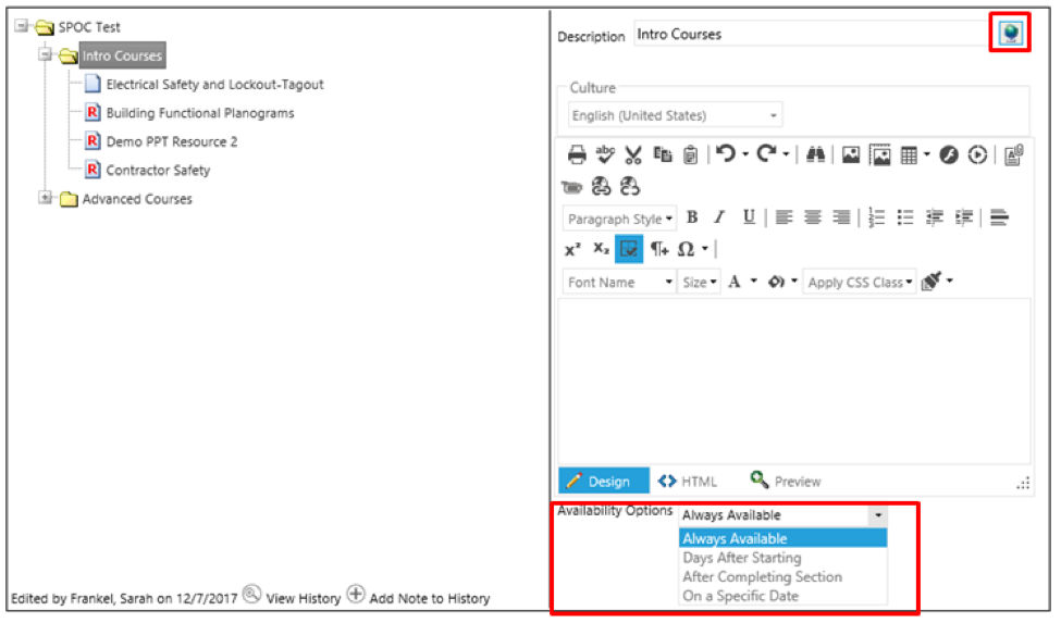 On the Description tab enter the course contents.  The contents of this tab will display within the SPOC resource as the actual resource.  The Description tab contains the full Rich Text editor, which means that pictures and videos can be embedded.  The HTML tab can also be used to support robust formatting.