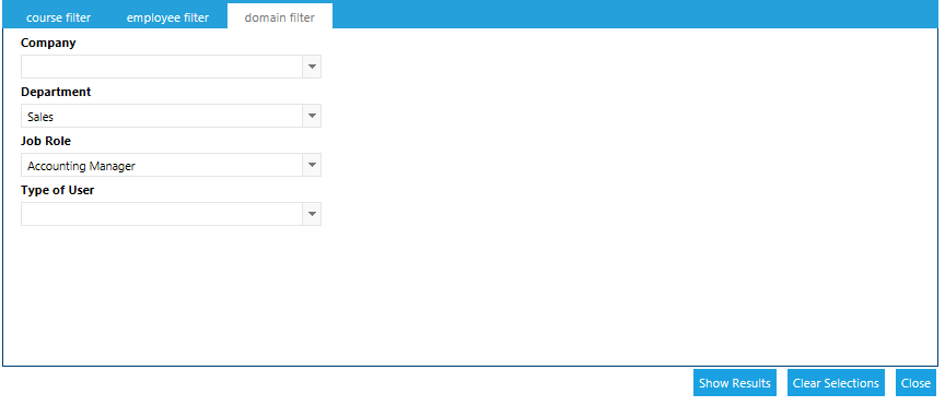 Example: On the View by Course option, you use the Domain filter to limit your results to just the Sales Dept. After you are done, you decide to switch to View by Person and need to select an employee in the Customer Service dept. If you don't Clear your Selections, your Sales Dept domain selection will limit your Employee Search to just employees in the Sales Dept.