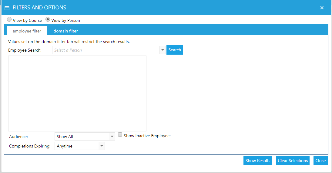 Example: On the View by Course option, you use the Domain filter to limit your results to just the Sales Dept. After you are done, you decide to switch to View by Person and need to select an employee in the Customer Service dept. If you don't Clear your Selections, your Sales Dept domain selection will limit your Employee Search to just employees in the Sales Dept.