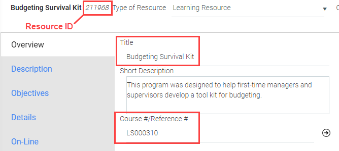 All of the above values can be found on the Overview tab of the selected courses on the Maintain Learning Resources screen.  You can also run a Catalog of Resources report to obtain this information.