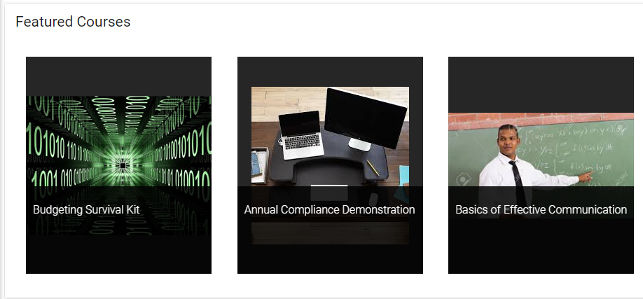 This widget allows the administrator to highlight active courses that may be of interest to the Homepage audience.  When a user clicks on the course title from this widget they will be taken to the course description where they can see more information about the course and enroll if desired.