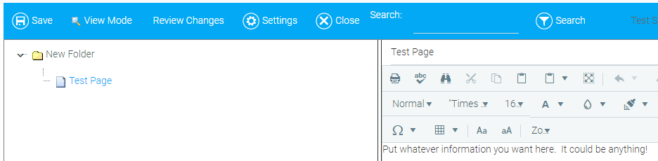 Provide a title for your first page and use the rich text editor to add content. This could include formatted text, links, graphics, etc. Click Save when you're finished with your entry.