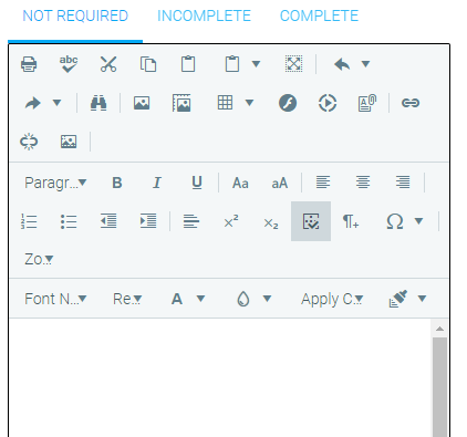 Once the class is selected, click on each status (Not Required, Incomplete, and Complete). A text window will open for you to enter the corresponding message for that status. When a user views this widget, they will only see the message that was entered for their current training status in the selected course. Be sure to enter text for each possible course status so that no user sees an empty widget.
