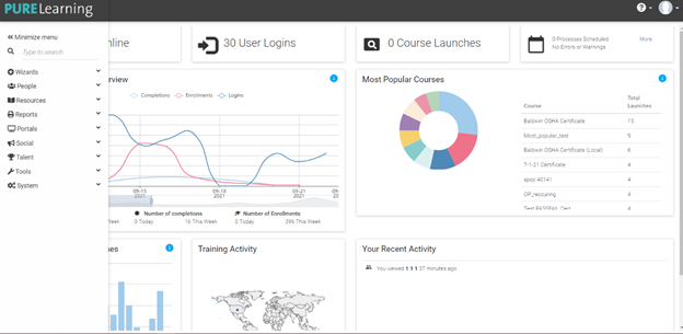 Dashboard widgets make it easier and more efficient for administrators to see data pertaining to the LMS.  Five dashboard widgets come standard to the Administrator's Home Page:  Training Activity Overview, Most Popular Courses, Popular Training Times, Training Activity, and Your Recent Activity.