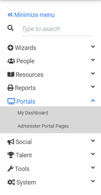 This is the Navigation Bar.  Here, you can access many different tools and resources within the LMS.  Click the down arrow to expand the menu under each category.  Once expanded, you can click the up arrow to hide the expanded menu again.  To hide the Navigation Bar, either click Minimize menu or simply click somewhere on the screen that is not within the Navigation Bar.