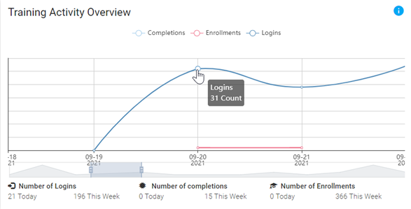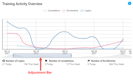 The Training Activity Overview widget shows all completions, enrollments, and logins over a period of time.  The default time period is one week, but the adjustment bar at the bottom of the graph can be used to increase the time up to one month or decrease the time to each hour in a day.  Click and drag the handles of the adjustment bar to alter the length of time shown.  Click and drag the entire adjustment bar to alter which time increments are displayed in the graph.