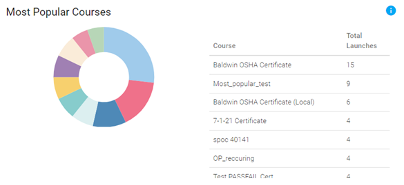 The Most Popular Courses widget counts each course launch per person for the previous 90 days.  The top 10 courses are displayed in the graph and chart.  Hover over each section of the graph to see the represented course and corresponding number of launches.
