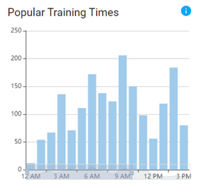 The Popular Training Times widget counts course launches by time of day and organizes the data into a bar graph.  The times displayed are in Eastern Standard Time (EST).  You can hover over each bar to see the exact number of launches at a specific time.  Use the adjustment bar at the bottom of the graph to change the times displayed in the graph.