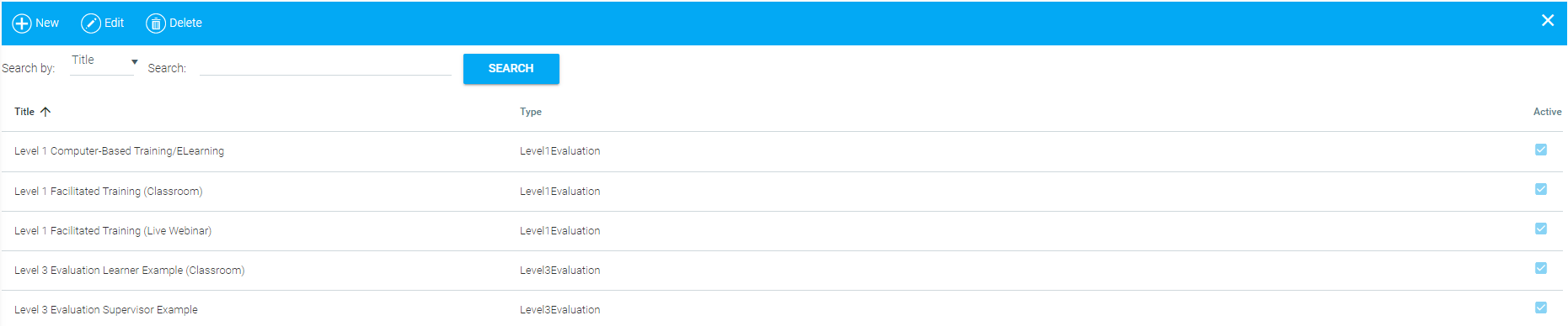 The Evaluation tool can be used to create custom Level 1 and Level 3 evaluations. These evaluations can then be associated with any resource within the LMS.