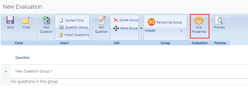 The screen pictured below, referred to as the Overview screen, is where all of the content will be added. Before you add the evaluation questions, you should set the Evaluation Properties.