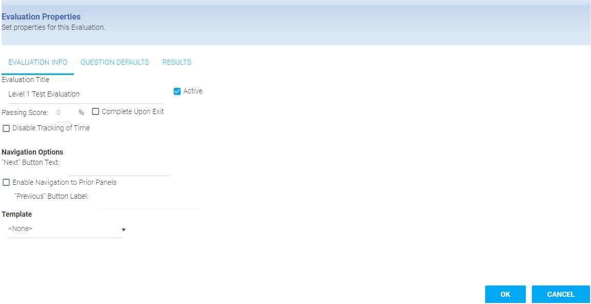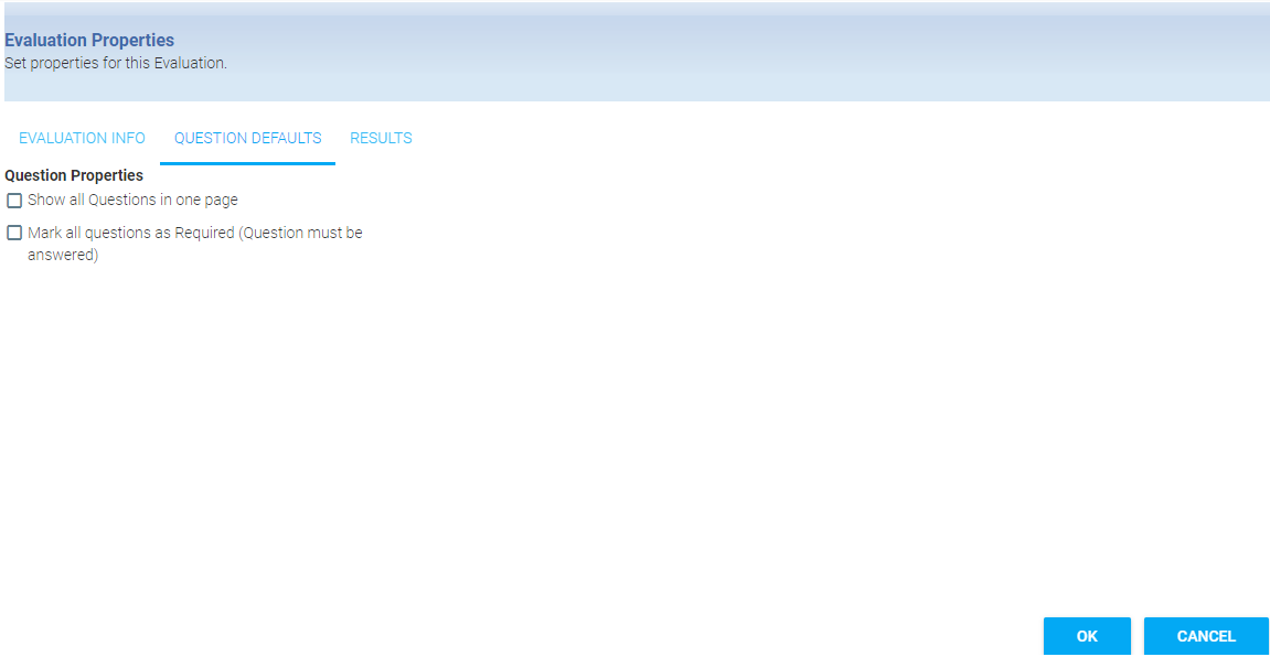 Once the Evaluation Info tab is completed, select the Question Defaults tab, which controls how questions are displayed.
