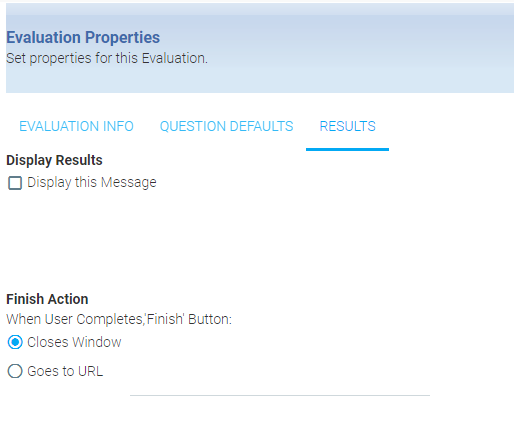 The final tab is the Results tab, which allows you to select a closing message and action.