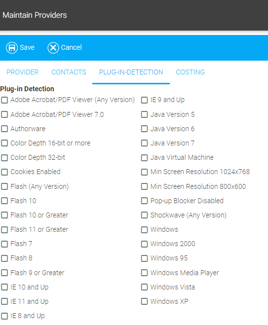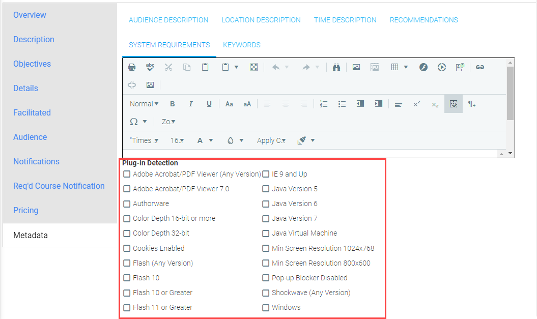 Plug-In detection can also be set at the provider level. Note that plug-in requirements for an individual course takes precedence over the provider's requirements.
