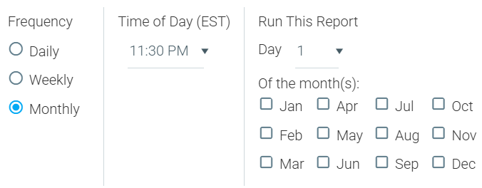 Use the Time of Day drop-down to select when the report should be run.  Remember that all report run times are in Eastern Standard Time (EST).